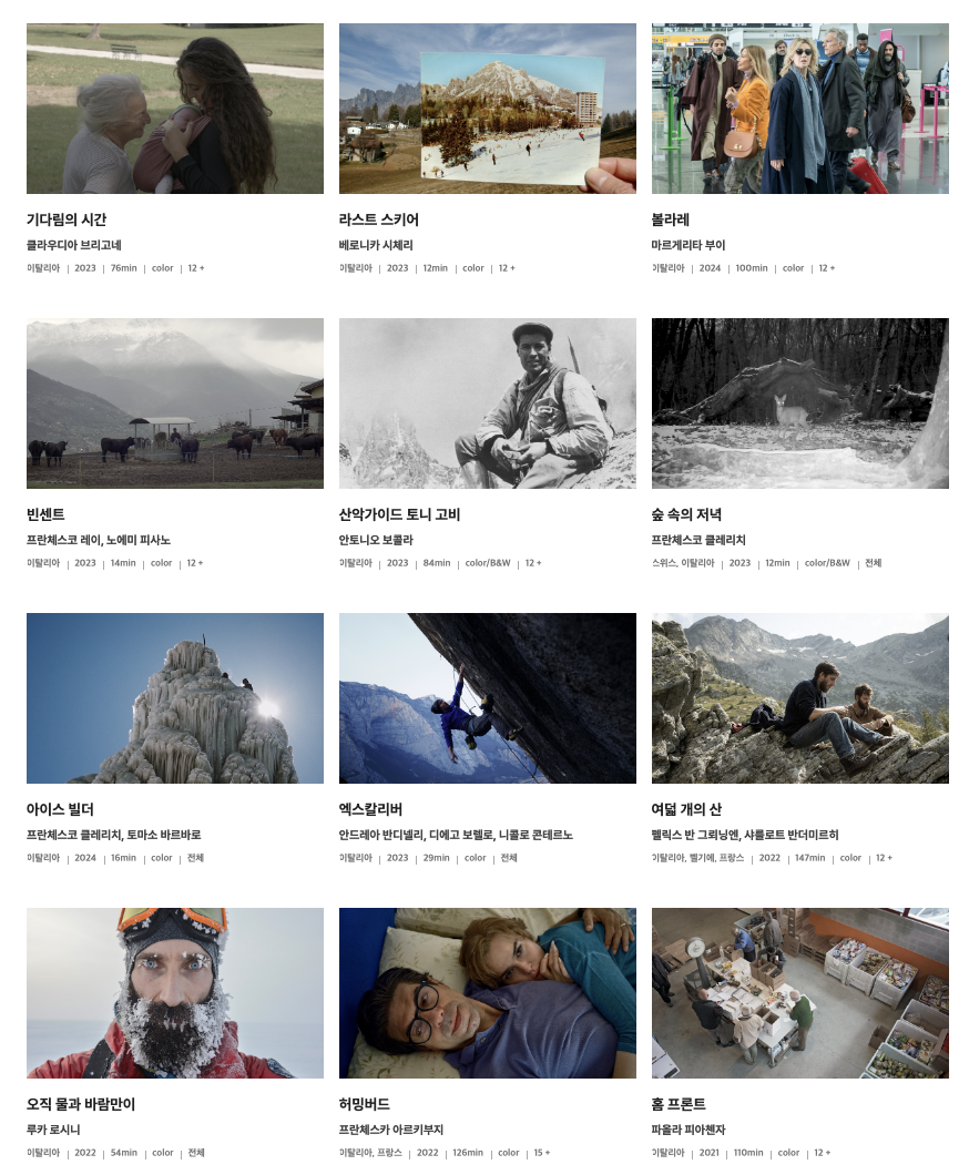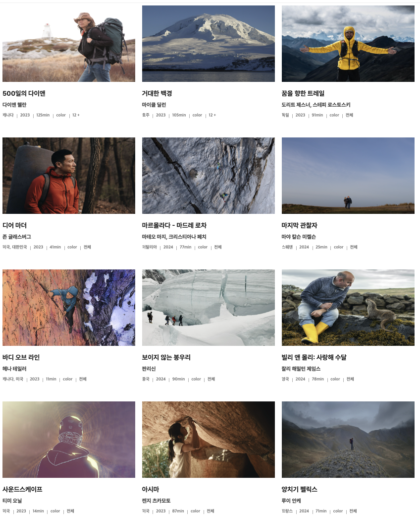 극한의 한계에 도전하는 인물이야기, 자연과 인간의 경계, 공존의 가능성등 현재 우리가 직면한 삶의 문제들을 다루며, 다양한 방식으로 관객에게 다가간다. 산과 자연을 주제로 한 다양한 작품들을 통해 관객들에게 깊은 감동과 영감을 전달하며, 산악과 자연을 사랑하는 이들에게 특별한 경험을 제공한다.