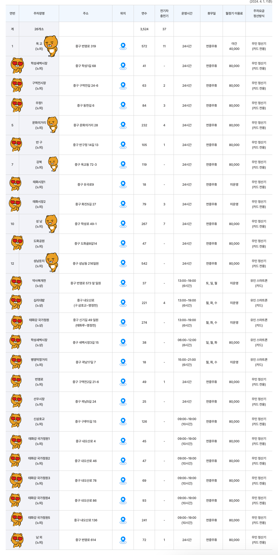 하지만, 옥교, 성남둔치, 성남, 강북, 문화의 거리 등의 대형 공영주차장 5곳은 장거리 주차를 방지하기 위해 기존처럼 유로로 진행한다.