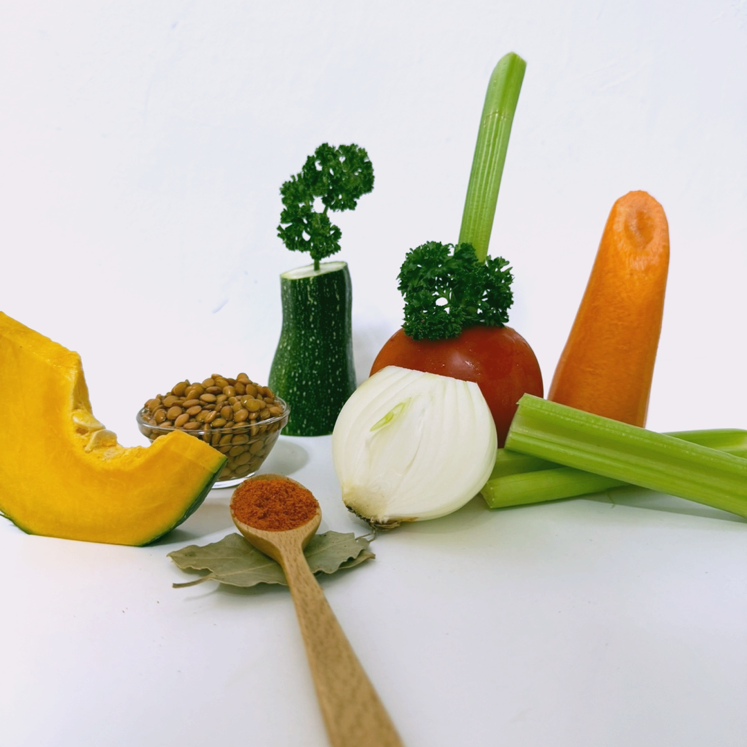 불린 렌틸콩, 양파, 당근, 셀러리, 주키니호박, 파슬리(바질도 같이 넣으면 좋다), 코코넛오일, 토마토, 단호박, 소금(2~3가지)